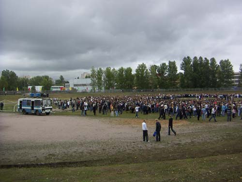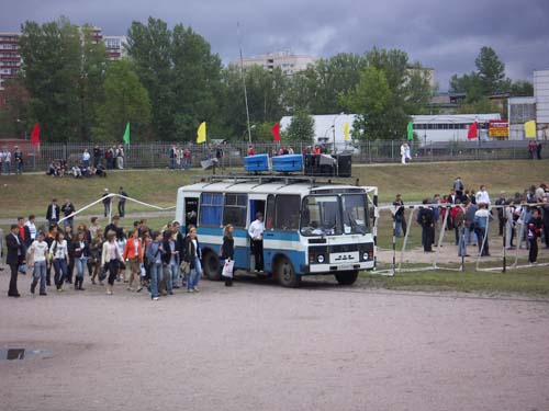Erstsemesterbegrüßungsparade im "Stadion" der Universität. Da es so etwas wie ein Audimax nicht gibt werden Großveranstaltungen draußen abgehalten. Laut- sprecher werden je nach Situation aufgebaut (auf dem Bus).