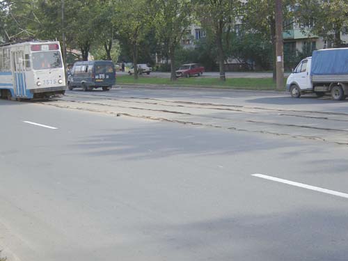 Man achte auf die Schienen der Straßenbahn. Zum Teil fehlen einige cm und die Schlaglöcher zwingen die Straßenbahn kaum schneller als Schrittgeschwindig- keit zu fahren.
